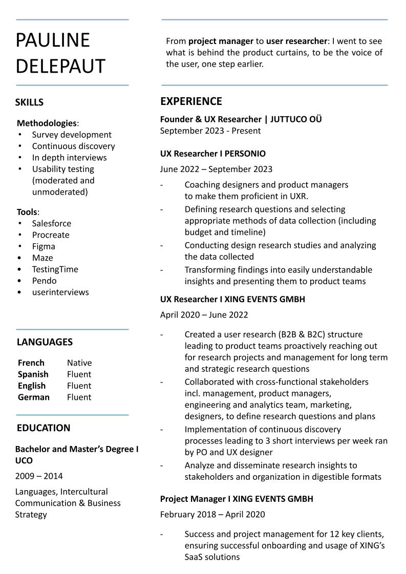 Eager to dig deeper into what drives users, I shifted into UX research—spending three years at XING and Personio, and two years as a UX research consultant and founder of Juttu.